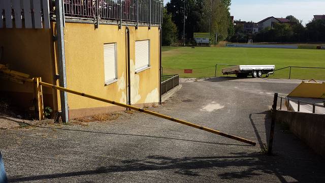 Am Morgen des 13.09.2015 (Sonntag) gegen 6 Uhr haben Unbekannte den abgestellten Anhänger unseres Wirtes gegen die Schranke zu unserem Vereinsgelände geschoben, worauf diese sich verbog und nachgab. So fuhr der Anhänger den abschüssigen Weg hinunter, durchbrach die Zuschauer-Absperrung zum Fußballplatz und blieb auf unserem A-Platz stehen.