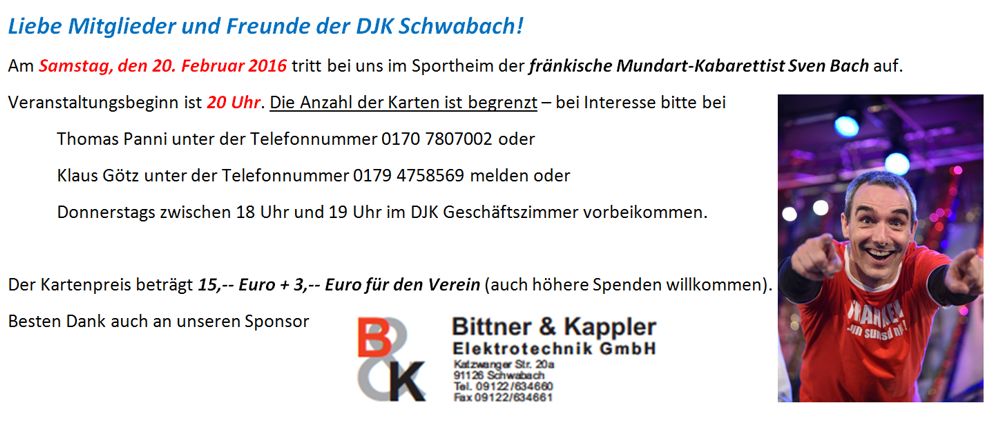 Am Samstag, den 20 Februar 2016 trat bei der DJK Schwabach der fränkische Mundartkabarettist Sven Bach auf. Er verzauberte das ausverkaufte Sportheim mit Gedichten, Fersen und Lieder. Jeder Teilnehmer war total begeistert. Es war ein rundum gelungener Abend mit viel Freude und Lachen. Auf dem Bild bedanken sich die beiden Vorstände Klaus Götz und Thomas Panni bei Sven Bach.