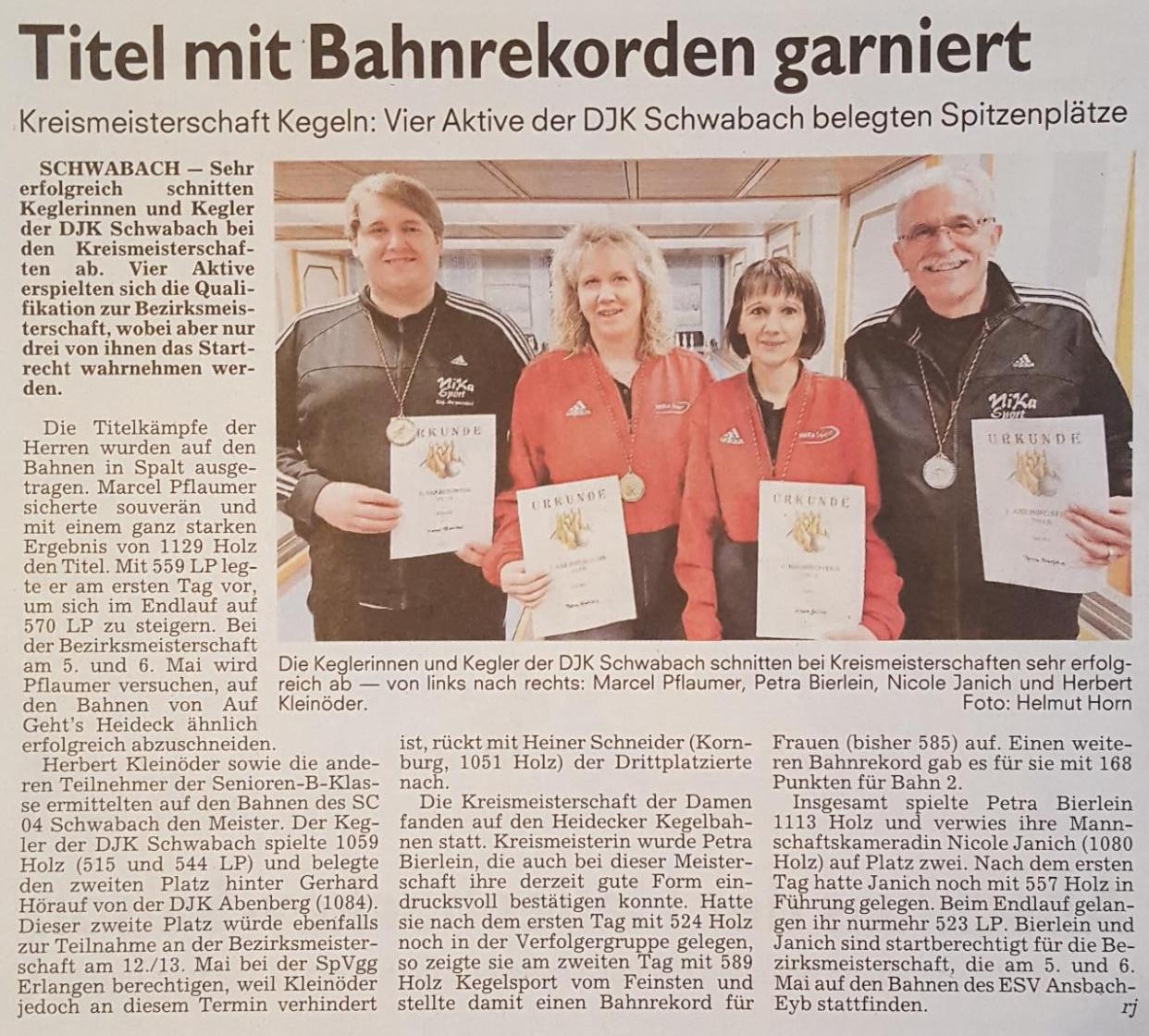 Der DJK-Diözesanverband-Eichstätt zeichnete Christine Schwöd von der Badmintonabteilung der DJK Schwabach mit dem DJK-Sportehrenabzeichen in Bronze aus. Christine Schwöd wurde in den letzten Jahren mehrmals Mittelfränkische Meisterin, Bayerische Meisterin und Süddeutsche Meisterin im Badminton. Diese Erfolge erzielte Sie im Doppel und im Mixed. Bei der Deutschen Meisterschaft erreichte Sie den 3. und den 5. Platz. Bei der Europameisterschaft belegte Sie den 8. Platz. Der berechtigt zur Teilnahme an der Weltmeisterschaft. Für diese großartigen Erfolge wurde Ihr das Sportehrenabzeichen verliehen.